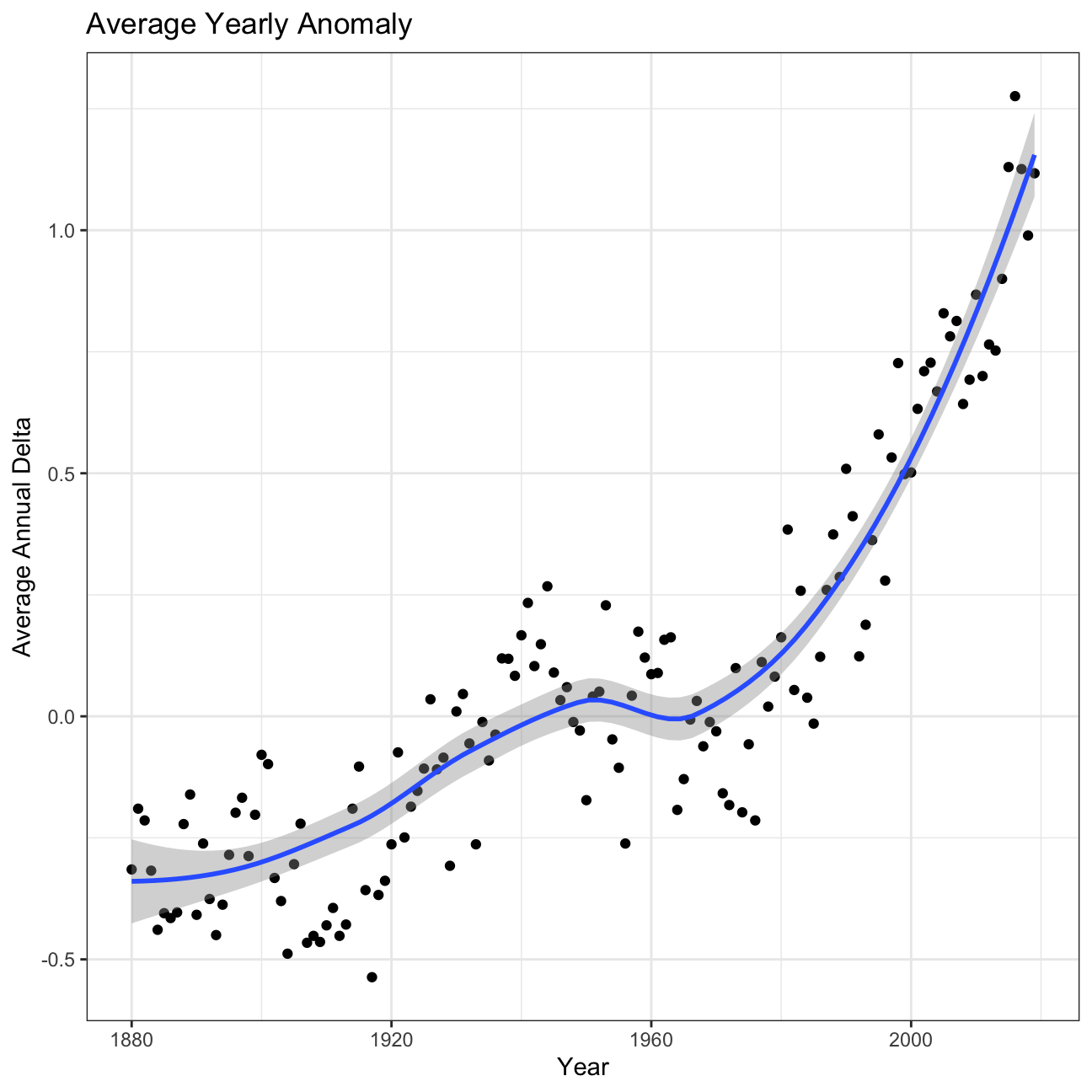 summarise(mean_delta = mean(year_mean_delta), # calculate summary statistics for yearly mean temperature deviation (delta)