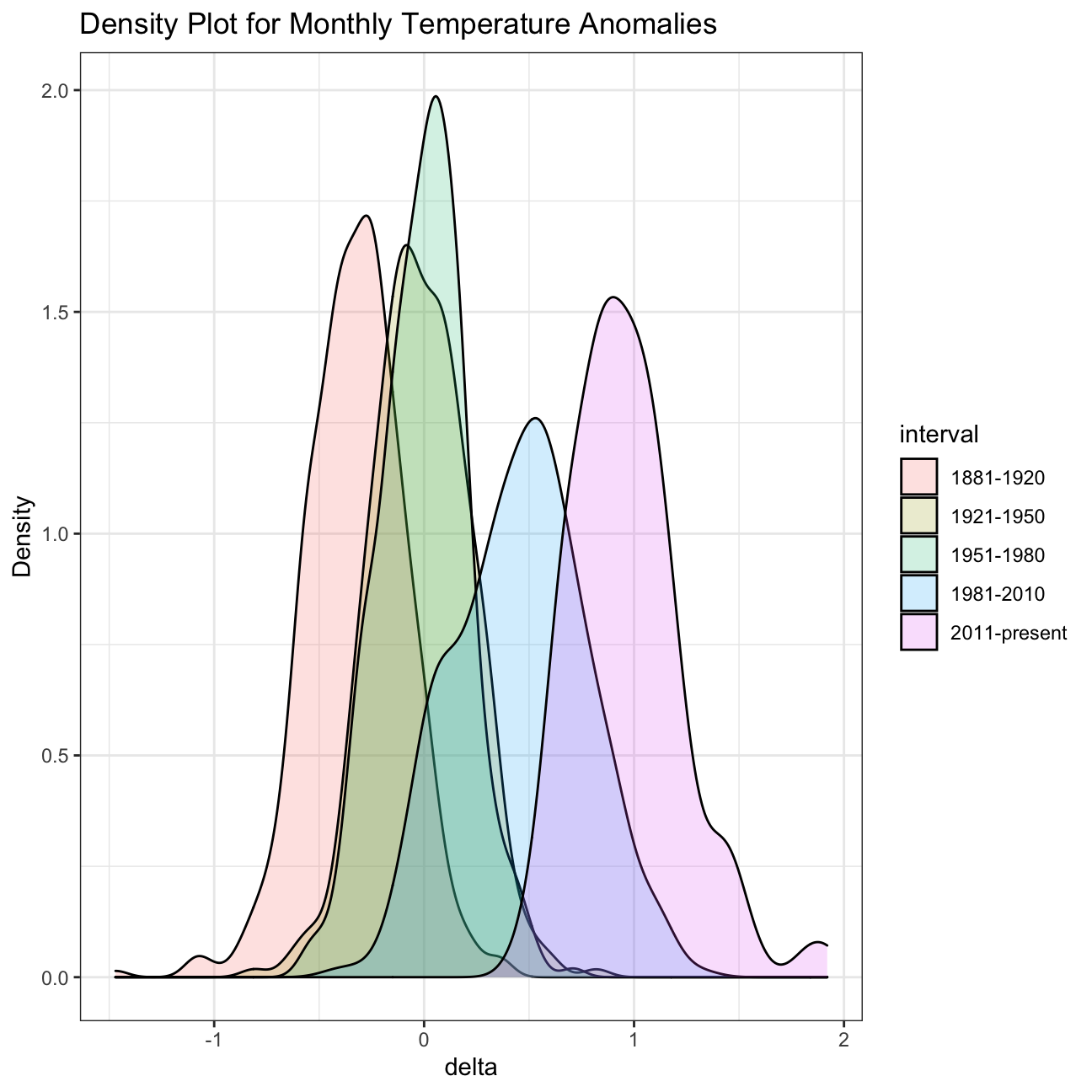 Now that we have the interval variable, we can create a density plot to study the distribution of monthly deviations (delta), grouped by the different time periods we are interested in. Set fill to interval to group and colour the data by different time periods.
