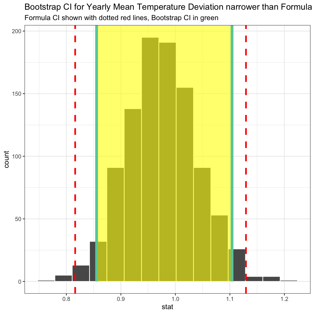labs(title='Bootstrap CI for Yearly Mean Temperature Deviation narrower than Formula CI',